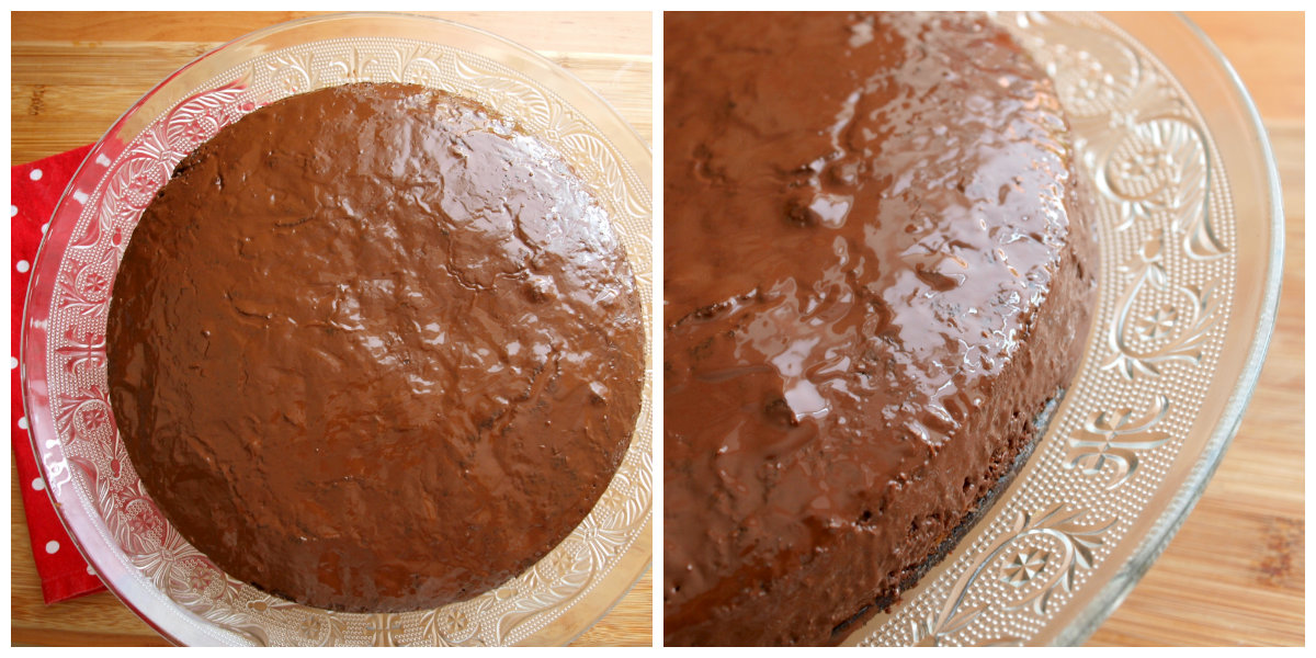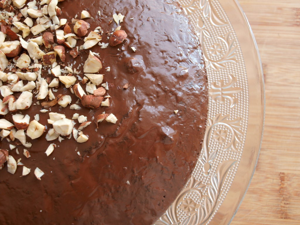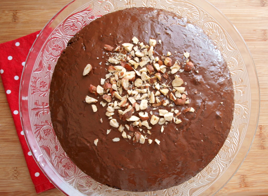 - Den fertigen Kuchen bestreichen wir danach mit geschmolzener Schokolade, dekorieren mit gehackten Nüssen und lassen stehen, bis die Schokolade fest wird. (optional)