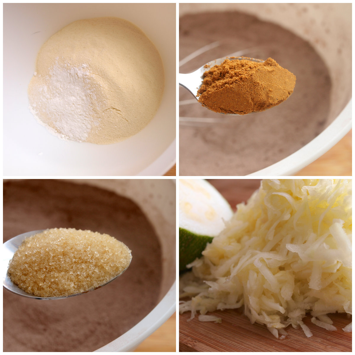 - Zuerst mischen wir die trockenen Zutaten, also Mehl, Backpulver, Kakao, Lebkuchengewürz, Salz, Vanille- und Rohrzucker, zusammen.
