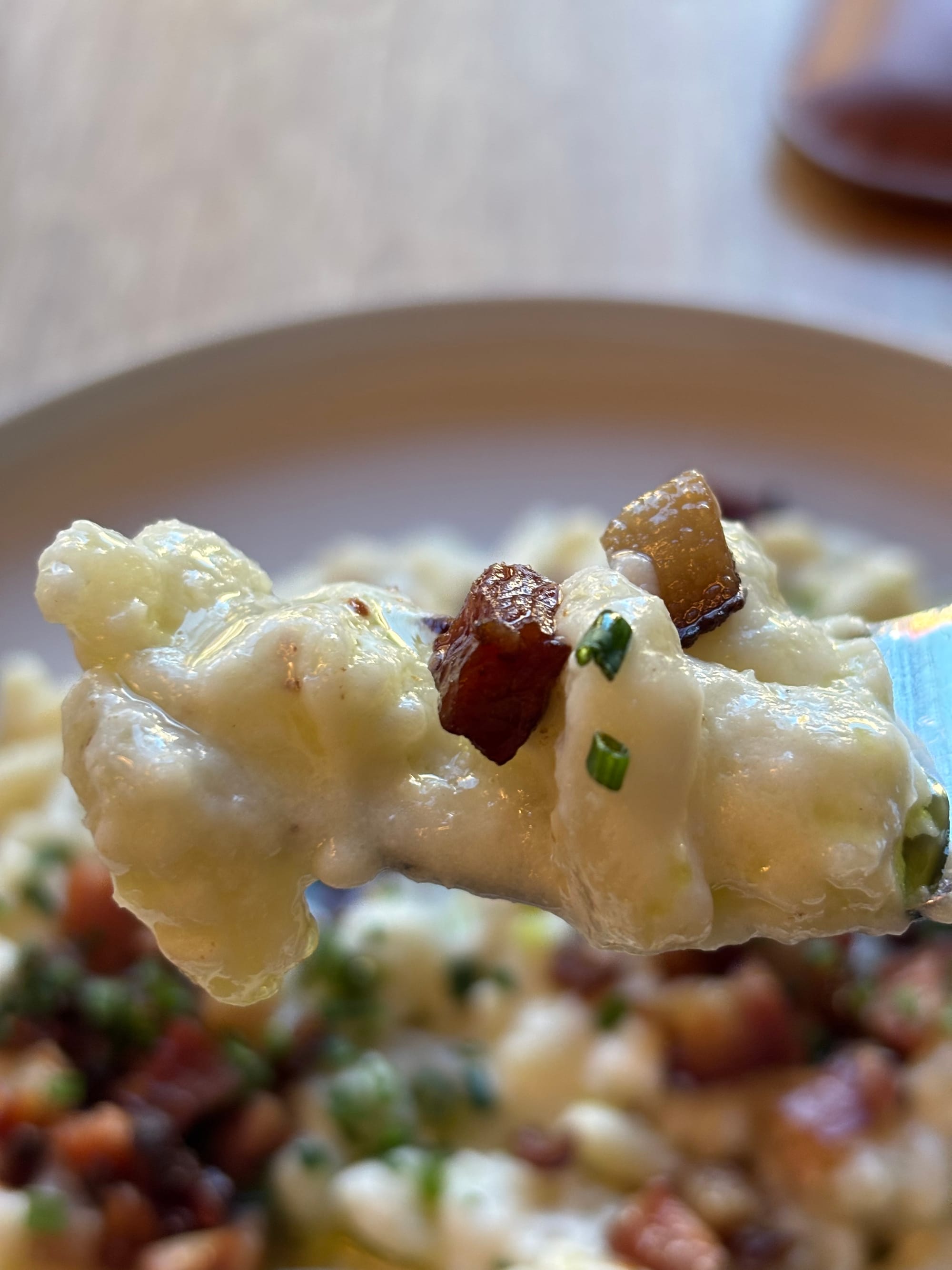 Mit knusprigem Speck und optional gehacktem Schnittlauch bestreuen. Nach Geschmack pfeffern.