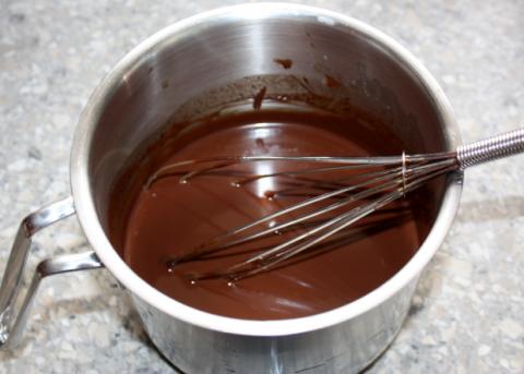 - Zuerst bereiten wir die Ganache zu, indem wir die Schokolade in heißer Schlagsahne schmelzen lassen. Danach lassen wir die Ganache abkühlen (ca. 2 Stunden lang).