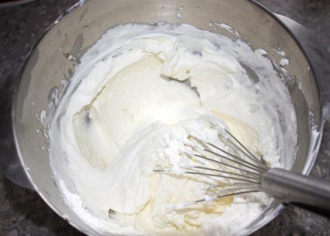 - Während dessen bereiten wir die Sahnefüllung zu. Wir schlagen die Schlagsahne mit dem Puderzucker zusammen. In einer anderen Schüssel schlagen wir Mascarpone mit Vanilleextrakt zusammen. Danach rühren wir beide Massen zu einer glatten Creme zusammen.