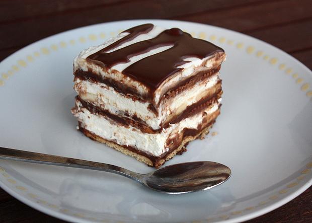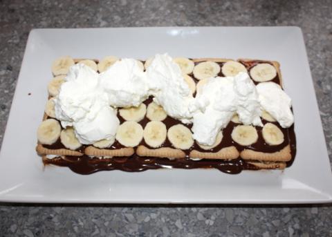Hiermit haben wir das Fotorezept für ein leckeres Dessert mit Schokolade, Bananen und Sahne, das man ohne Backen zubereiten kann. 😛